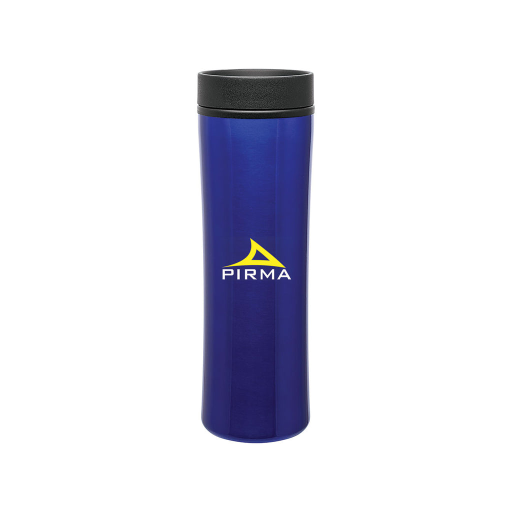 Enjoy your beverages at just the ideal temperature with this ETS Blue Cyrus Stainless Steel Tumbler 16 oz featuring a double wall construction, a plastic inner wall lined with foam insulation and a push-on swivel lid. Adorn this tumbler with your brand name or logo to get the recognition your business deserves.