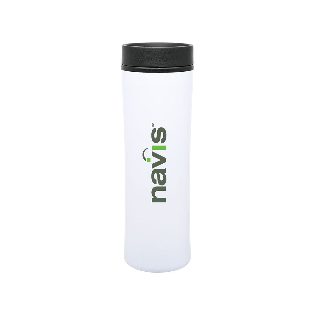 Enjoy your beverages at just the ideal temperature with this ETS White Cyrus Stainless Steel Tumbler 16 oz featuring a double wall construction, a plastic inner wall lined with foam insulation and a push-on swivel lid. Adorn this tumbler with your brand name or logo to get the recognition your business deserves.