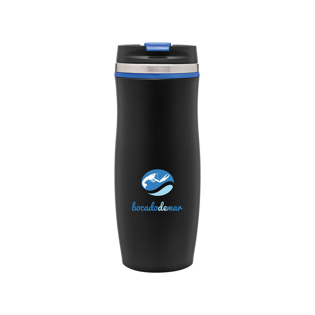 This ETS Black/Blue Berlin Black Stainless Steel Tumbler 12 oz is perfect for both hot and cold beverages. Drinking on the go has never easier thanks to this stylish tumbler designed with a threaded snap-fit lid! It is ideal for use as a corporate gift with an imprinted logo to create impactful exposure of brand.