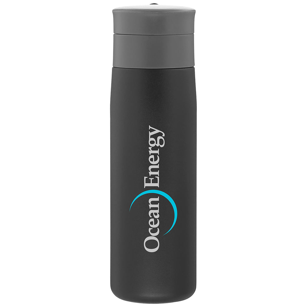 H2Go Matte Black Lure 10 oz Water Bottle with custom printed logo is a handy smaller water bottle that is great on walks, short commutes, or to refill during a long day at the office. The smaller size means this is lightweight, but still keeps drinks the right temperature while you enjoy. The double wall stainless steel thermal bottle has copper vacuum insulation and a threaded dual opening lid with a removable strainer. Great for camping, the carrying strap is easy to throw over a shoulder or hook to a pack. Add a company logo to use as an employee giveaway or incentive item to put out at trade shows. Place an order today.The minimum order for this product is 48 pieces.