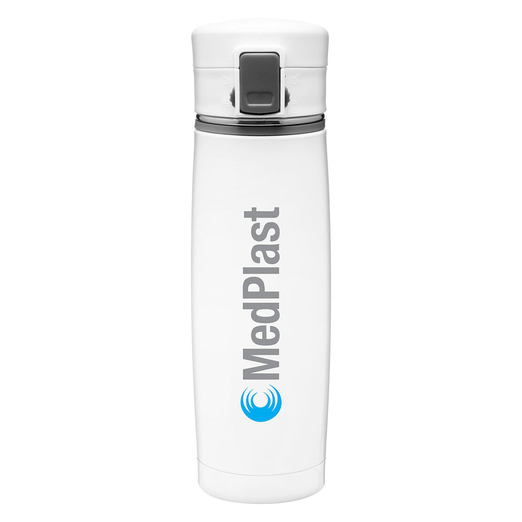 Copper vacuum insulation fused with 18/8 grade stainless steel construction, lock mechanism, and push-button lid highlights this 16oz. tumbler. It keeps drinks fresh at an optimum temperature for hours. An ample print space allows ETS White/Storm Grey Viper White Stainless Steel Tumbler 16 oz to feature custom logo imprint for use as a corporate gift or in promotional campaigns.
