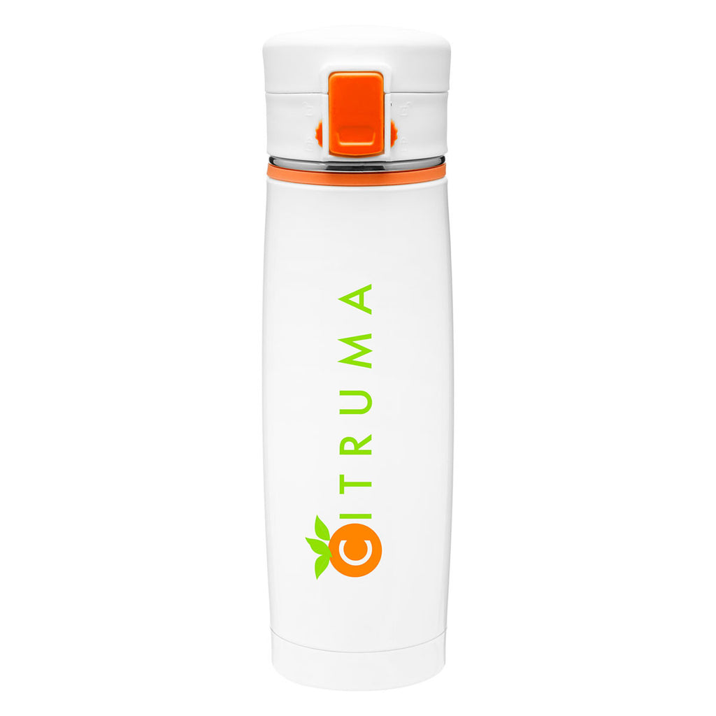 Copper vacuum insulation fused with 18/8 grade stainless steel construction, lock mechanism, and push-button lid highlights this 16oz. tumbler. It keeps drinks fresh at an optimum temperature for hours. An ample print space allows ETS White/Orange Viper White Stainless Steel Tumbler 16 oz to feature custom logo imprint for use as a corporate gift or in promotional campaigns.