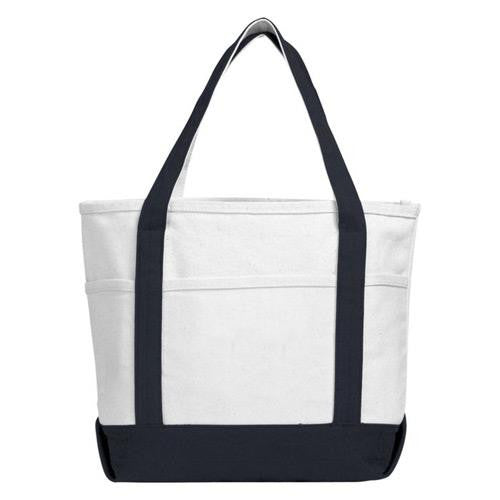 The Atchison Navy Sea Breeze Canvas Boat Tote is the ideal storage unit for outdoor recreational activities. Store sunglasses and sun tan lotion in one of the three front slip pockets. Bring along your favorite book for an afternoon at the beach. The reinforced bottom prevents your belongings from succumbing to impact and moisture damage. Shoulder length handles give you the option of carrying the tote by hand or carrying your things on your shoulder. The stylish design of the tote is sure to turn heads at the beach. Just remember to attach a custom logo to take advantage of the free publicity. The minimum order for this product is 25 pieces.Highlights