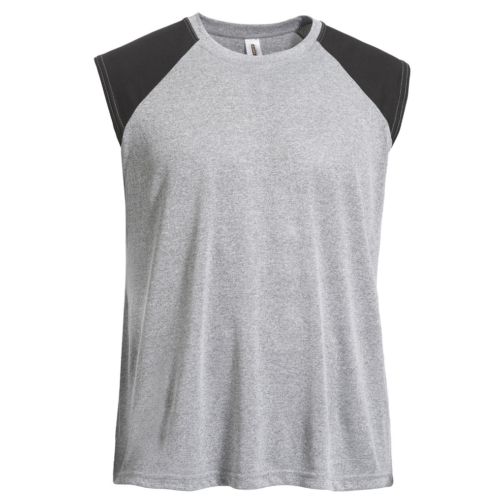 Turn heads without even making a move in this Expert Men's Heather Grey/Black Sleeveless Colorblock Natural Feel Training Tee. Contrast oXymesh shoulder panels lend it a preppy vibe while still maintaining its masculinity. It's made of cotton like microfiber poly jersey that with wicking properties that will deflect any sweat that develops as you workout. Treated with BodyFreshe antibacterial technology to ward of odor. A versatile option for companies looking for custom logo tees made with an active lifestyle in mind.