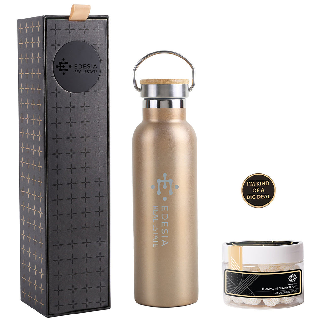 Say "Congrats" in a custom way with the Batch & Bodega Award Winner kit. So much better than a cheap plastic trophy to get acknowledgment, this gold 21 oz Breckenridge Stainless Steel bottle comes with Champagne Gummy drops and an "I'm kind of a big deal" lapel pin. Perfect for office acknowledgments, graduation parties, or special events. Order today.The minimum order for this product is 1 piece.