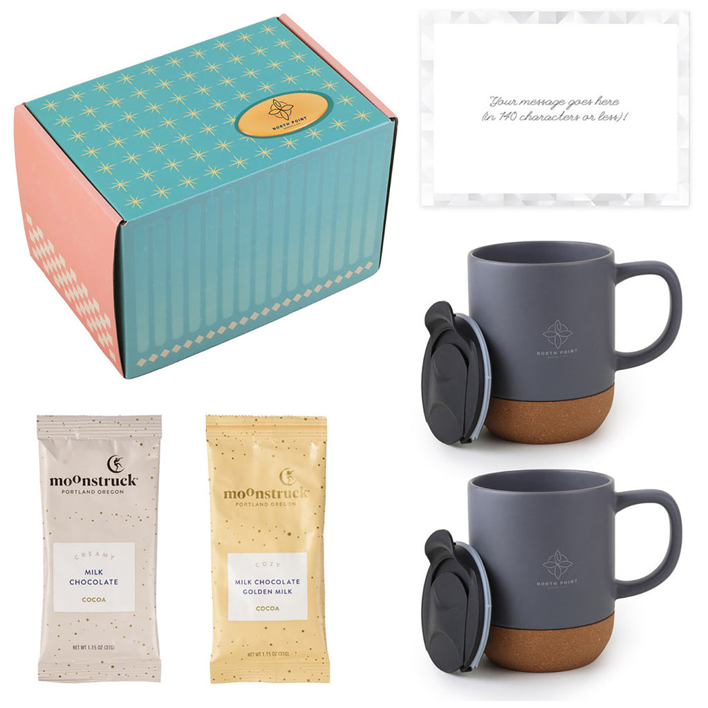 • Kit Contains: Two customizable Evora Cork Base Ceramic Mugs, Moonstruck Chocolate Co. Milk Chocolate Cocoa Single Serve Packet (1.15 oz), Milk Chocolate Golden Milk Cocoa Single Serve Packet (1.15 oz), and a customizable note card.
