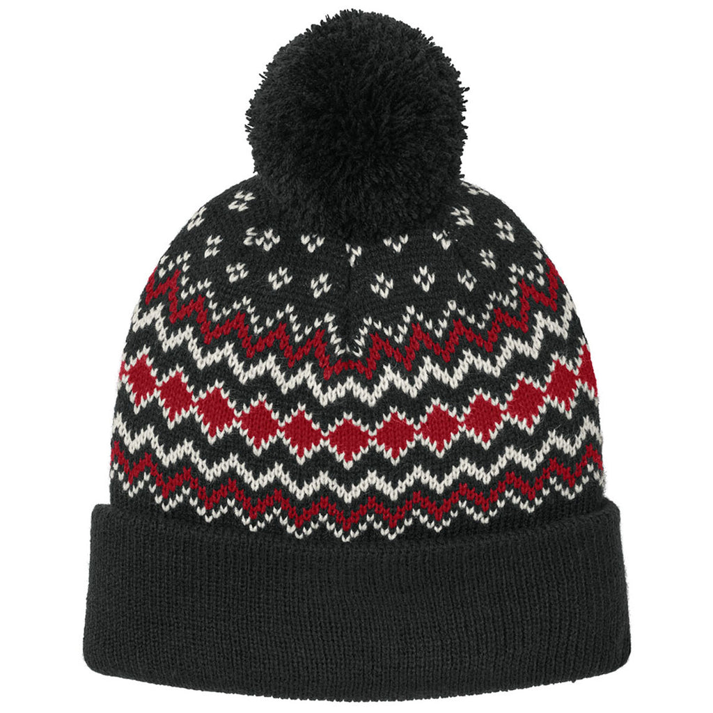 Port Authority Deep Black/Rich Red/Marshmallow Alpine Pom Beanie