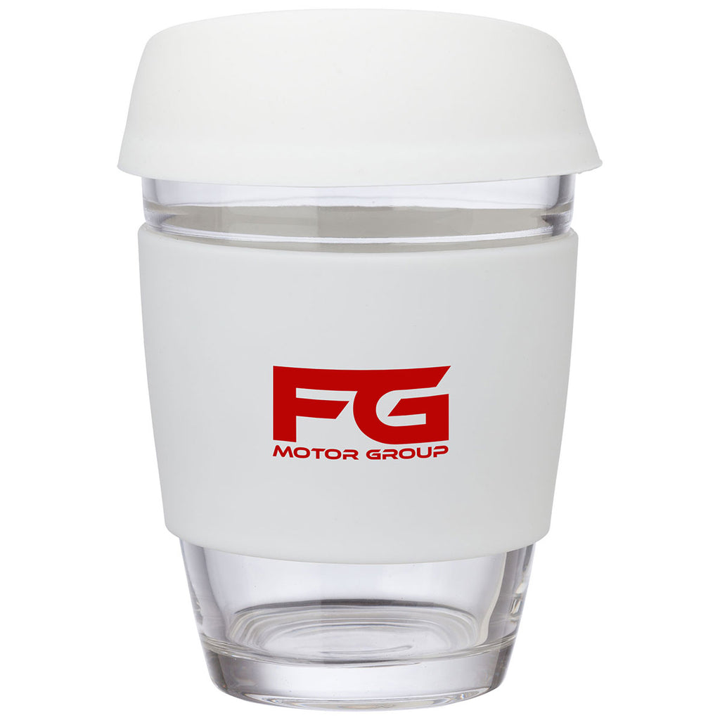 Perka White Rizzo 12 oz. Glass Mug with Silicone Grip & Lid