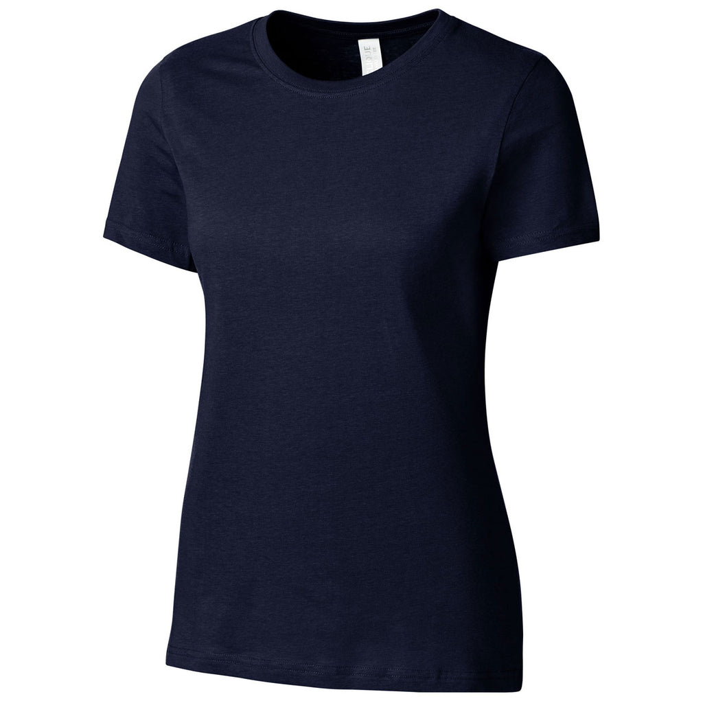 Change how your employees view corporate apparel by giving away the Clique Women's Navy Playlist Tee. The stylish tee makes an ideal promotional gift at sales conferences and industry trade shows. Screen print a custom logo on the tee to connect your brand to high quality products and services. Designed with 100% ringspun cotton, the super soft tee delivers optimal comfort throughout a busy day competing in a company sponsored golf tournament. Side seam resist rips and tears to give you a versatile tee to wear at work and play for years to come.