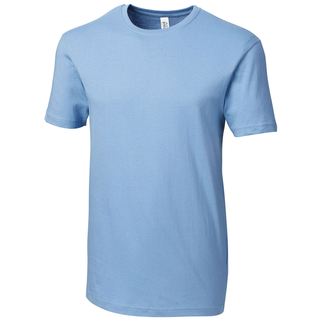 With rip and tear resistant side seams, the company logoed Clique Men's Light Blue Playlist Tee remains in mint condition years after withstanding the punishment delivered by an active lifestyle. Order the tee in bulk to have plenty of employee uniforms in stock. One-hundred percent ring spun cotton feels smooth on the skin to keep your team energized in the field. The easy to tear away tag allows you to screen print your corporate logo for increasing recognition of your company in the community. Wear the multi-purpose tee to work and keep it on later in the day when you relax with professional peers at your favorite restaurant.