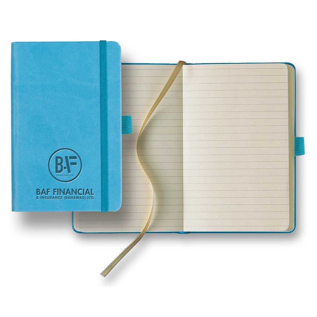 Tucson Small Ivory journal flaunts a well-earned reputation for its stately silhouette courtesy of 192 gray-lined pages of Ivory paper and leather-like cover. This pocket-sized notebook will deliver a clear message to its recipients: "I mean business." It can be customized with debossing or foil detail of your custom logo.
