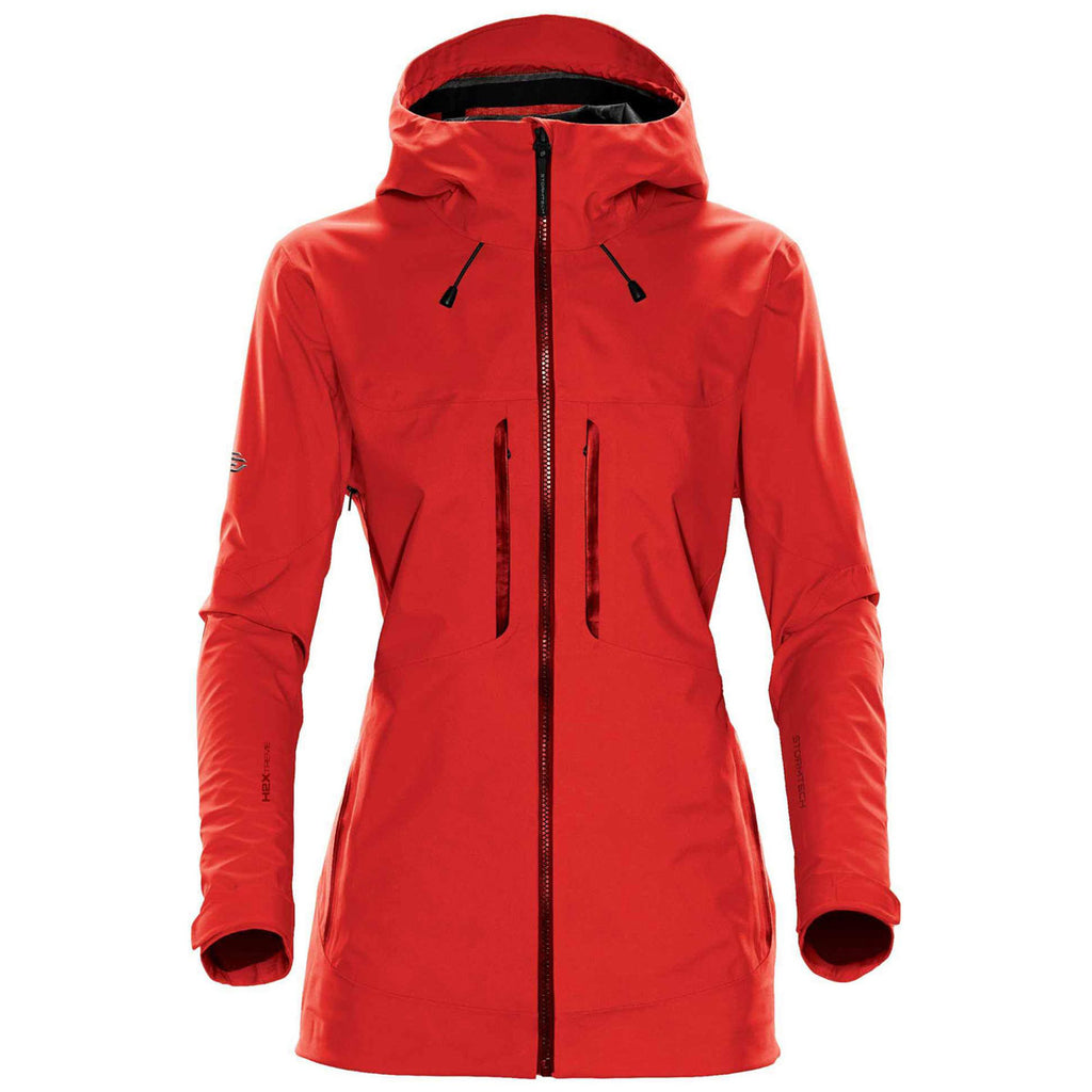 Be prepared for anything with this Stormtech Women's Bright Red Synthesist Stormshell. Perfect for employee apparel in wet weather areas, this jacket features H2XTREME technology and front pit zips, making it waterproof yet breathable. The jackets body has been tailored to fit snugly, but with articulated joints and stretch that allows for unhindered full-range of motion. Finished with a cold weather temperature rating of 14 Degree F-50 Degree F, a full coverage hood, and plenty of room for customer company logo embroidery, this jacket is an corporate gift that your team would love to receive.Corresponding Men's Style: Stormtech Men's Bright Red Synthesist Stormshell