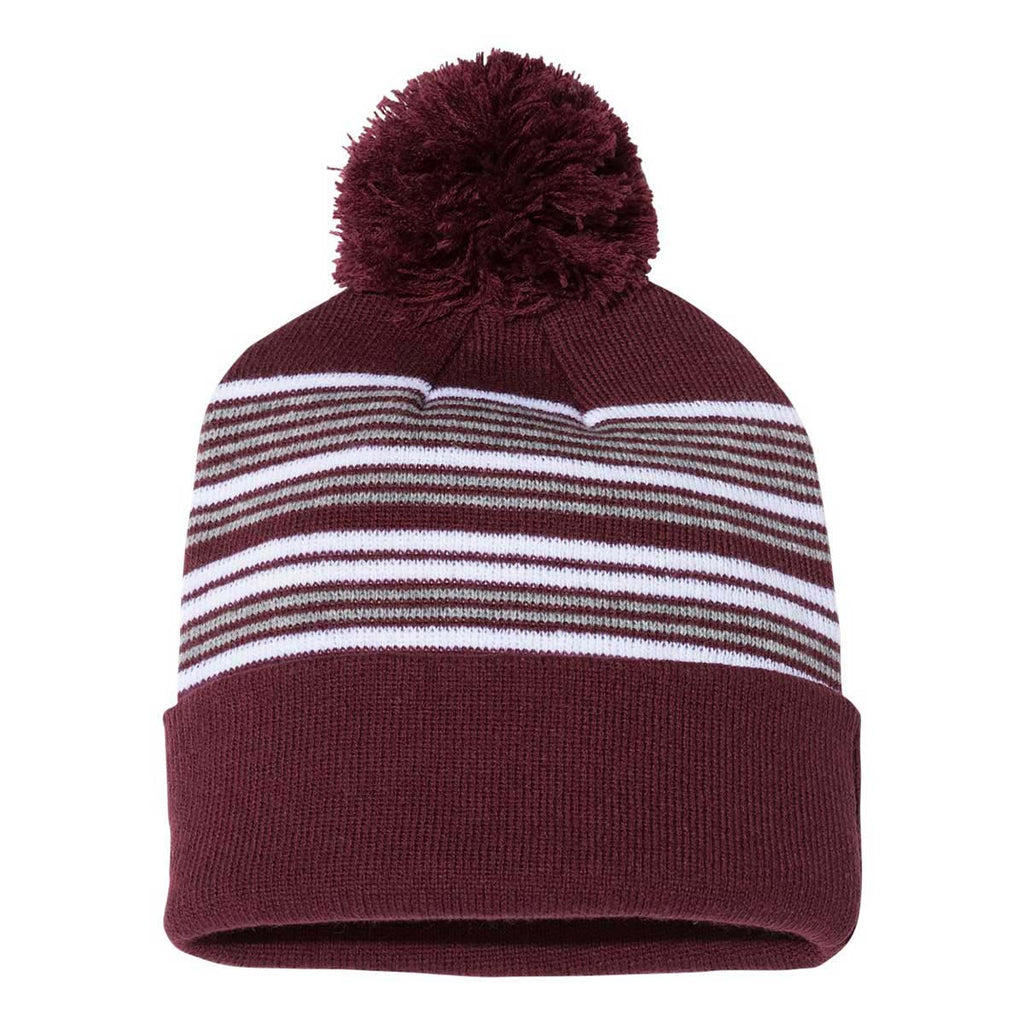 Sportsman Maroon/White/Grey 12" Striped Pom-Pom Knit Cap