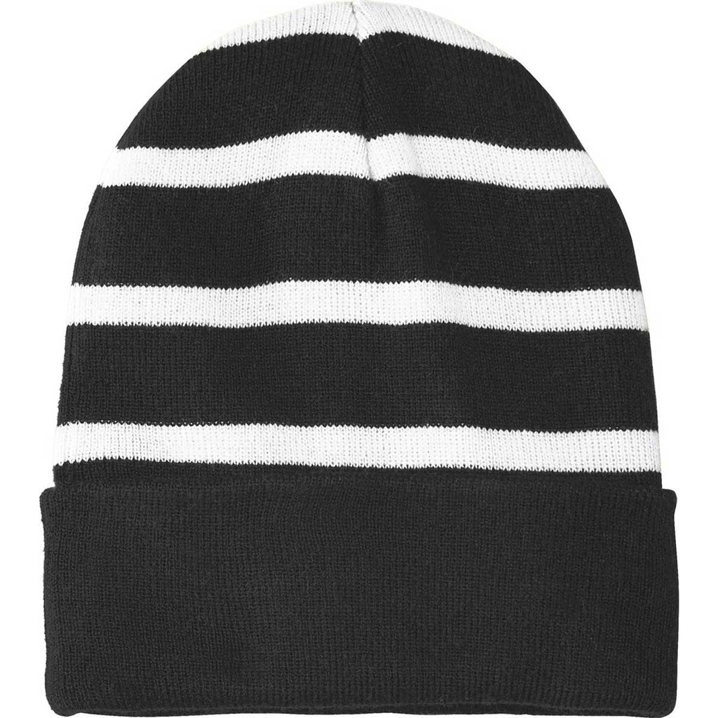 Sport-Tek Black/White Striped Beanie with Solid Band