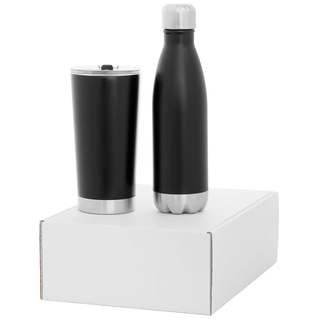 Set your brand apart in the best way possible by adding your company's custom logo or design to the ETS Black Tumbler and Bottle Gift Set. This two-piece corporate gift set comes complete with an insulated tumbler and bottle, both which come packaged within a high-quality white corrugated gift box.