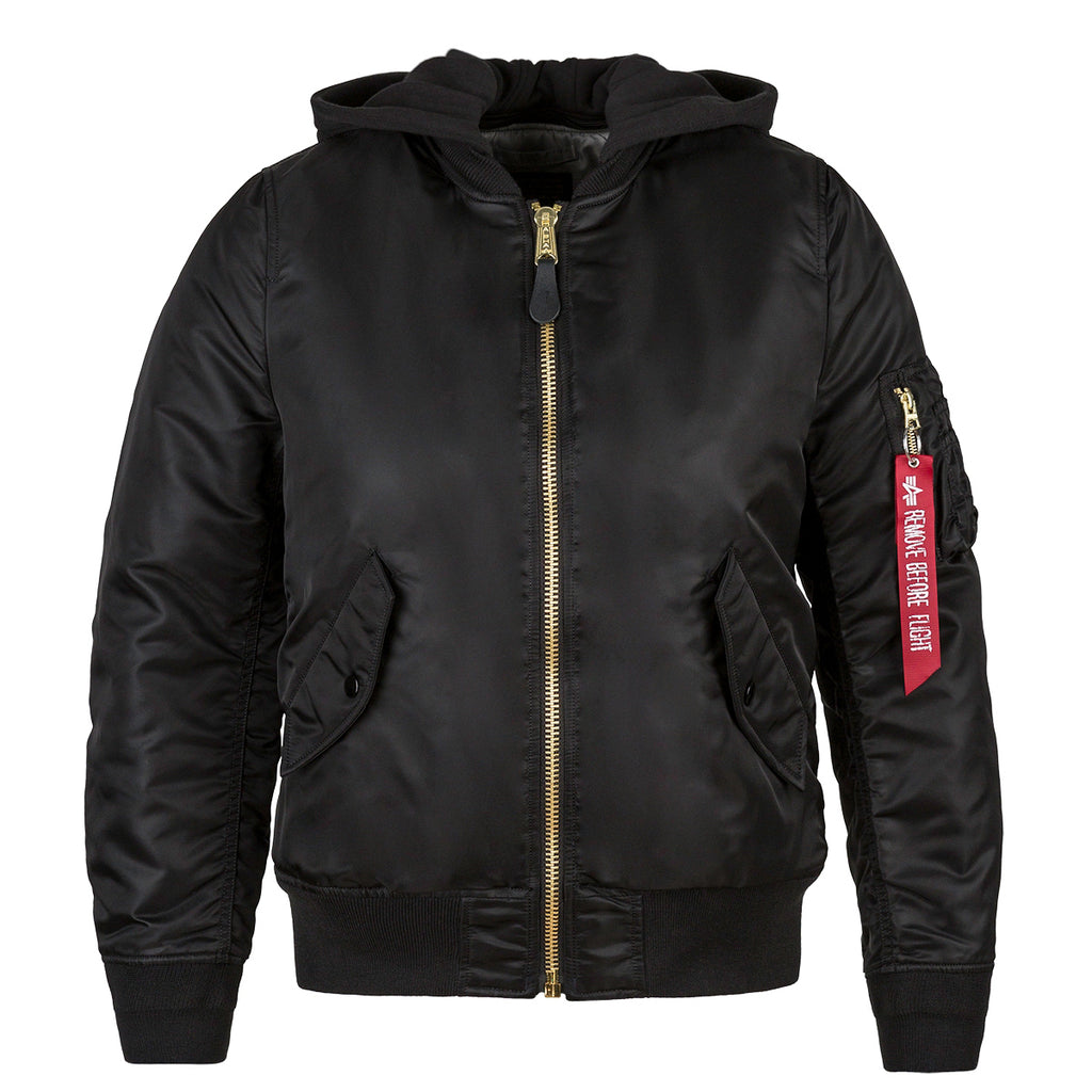Alpha Industries Women's Black/New Silver Lining MA-1 Natus Flight Jacket is the Alpha classic slight nylon style with removable fleece hood. Ideal for those who need to look great while spending time in the great outdoors, this flight jacket can go from runway to outdoor wear with ease. Add a custom logo or corporate embroidery to the already extraordinary jacket to use as employee apparel or use the logoed flight jacket as is to use as fashion apparel. The signature red 'Remove Before Flight' flag offers a high end look to a functional piece of your wardrobe. With two exterior flap pockets and an interior welt pocket the jacket offers plenty of storage. A clean look is created by the ottoman knit cuffs, knit rib collar, cuffs, and waistband. Order yours today for employee gifts for the next big occasion.Highlights